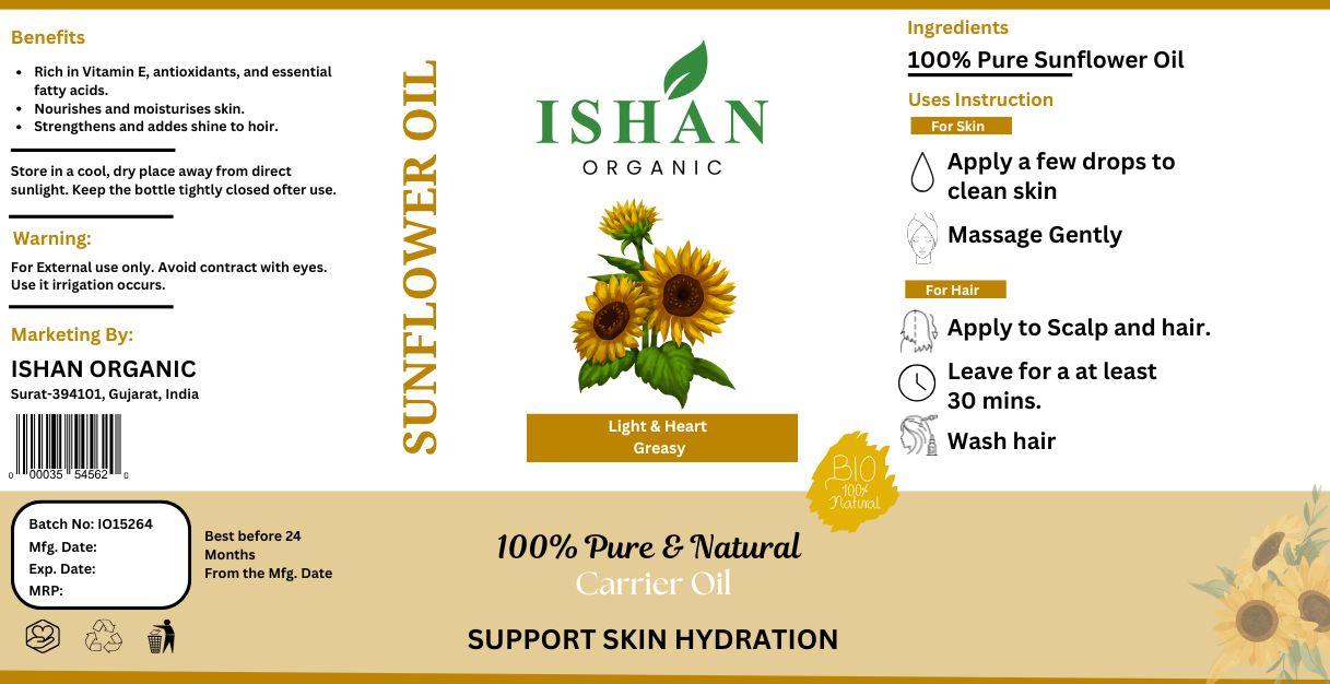 Experience the benefits of Sunflower Oil, a light and nutritious oil packed with vitamins, antioxidants, and healthy fats. Ideal for cooking, skincare, and hair care, it promotes heart health, nourishes the skin, and strengthens hair.